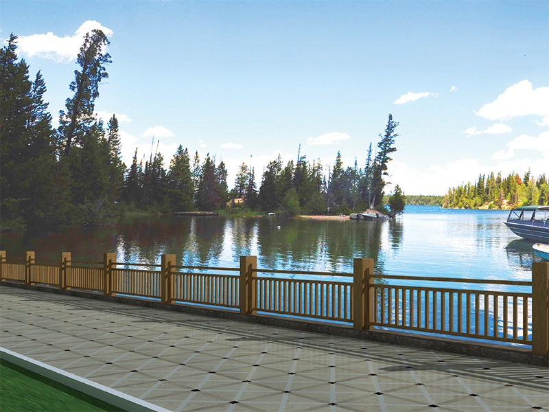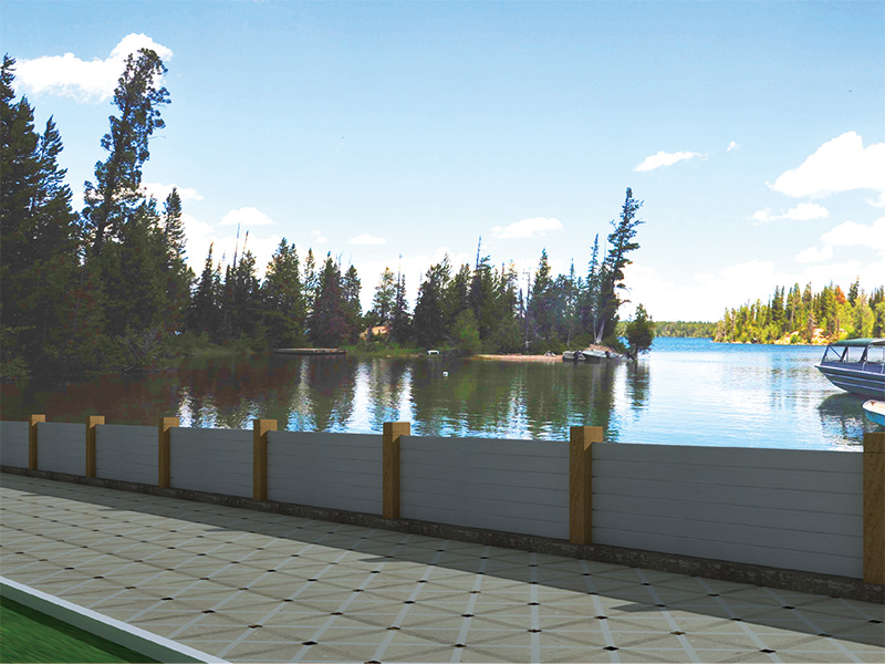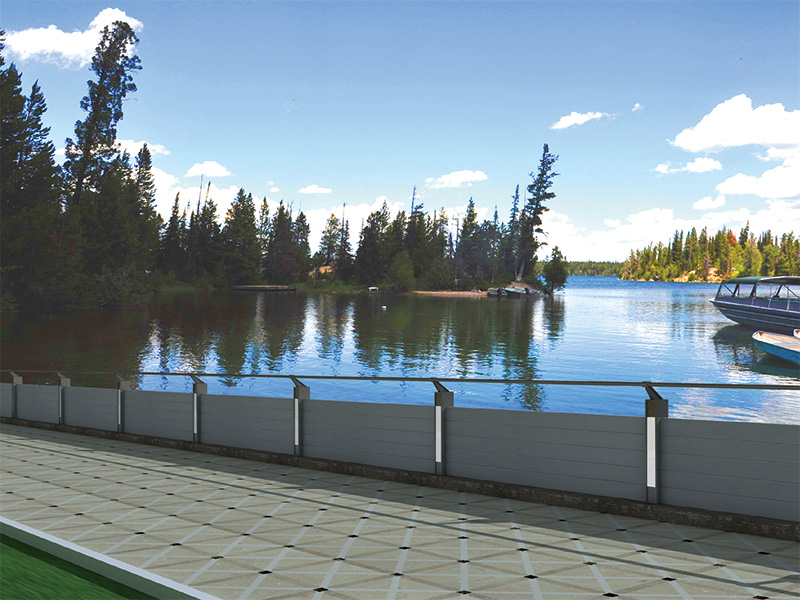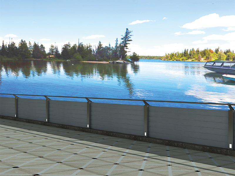 景观式铝合金防洪墙,采用铝合金加工制造,表明可配合周边景观要求做出相适应效果。可安装LED光源,实现对夜景的亮化。在汛期插上挡板可防洪,非汛期插上护栏对行人进行防护,一种产品两种功能。该系统产品适合对景观要求高,又需要防洪的区域使用。